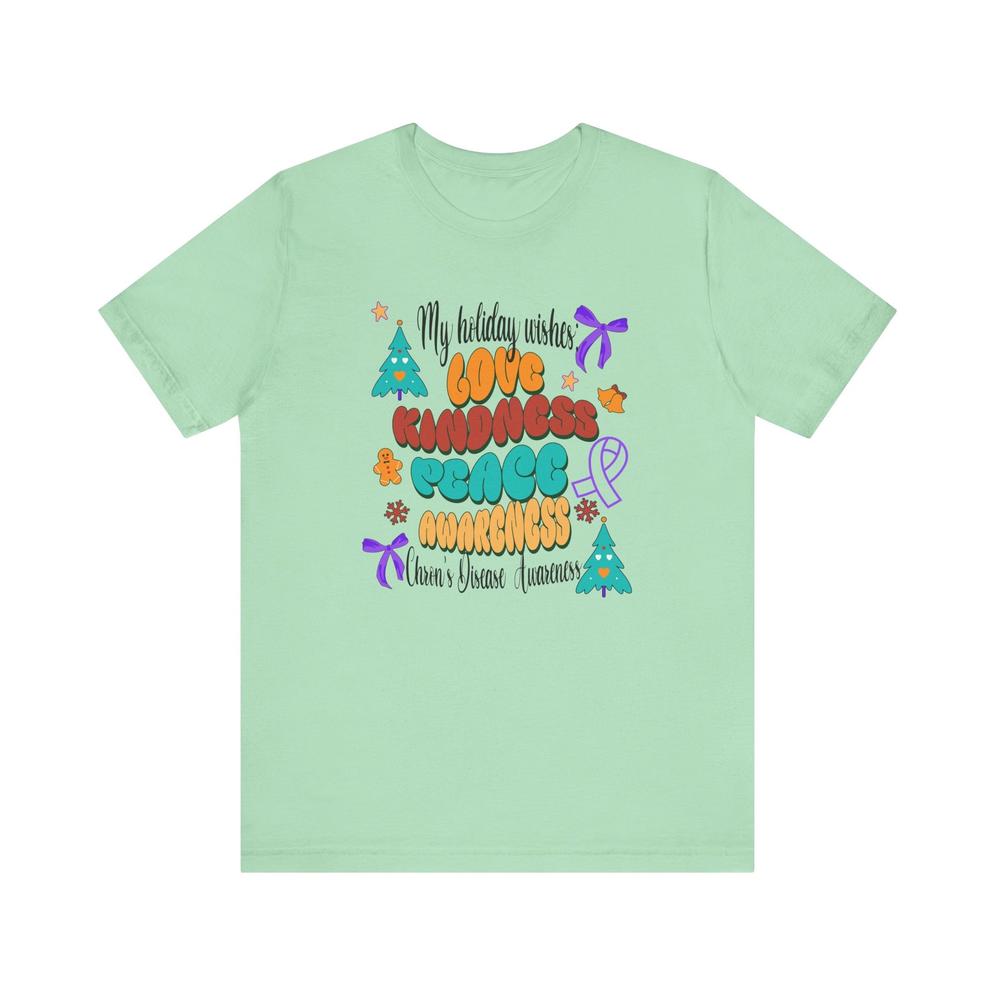 Chron's Disease Awareness Holiday Theme unisex t-shirt Made with 100% Airlume combed and ring-spun cotton, a lightweight fabric (4.2 oz/yd² (142 g/m²)) that is easy to layer, breathable. Perfect for active and leisure wear.