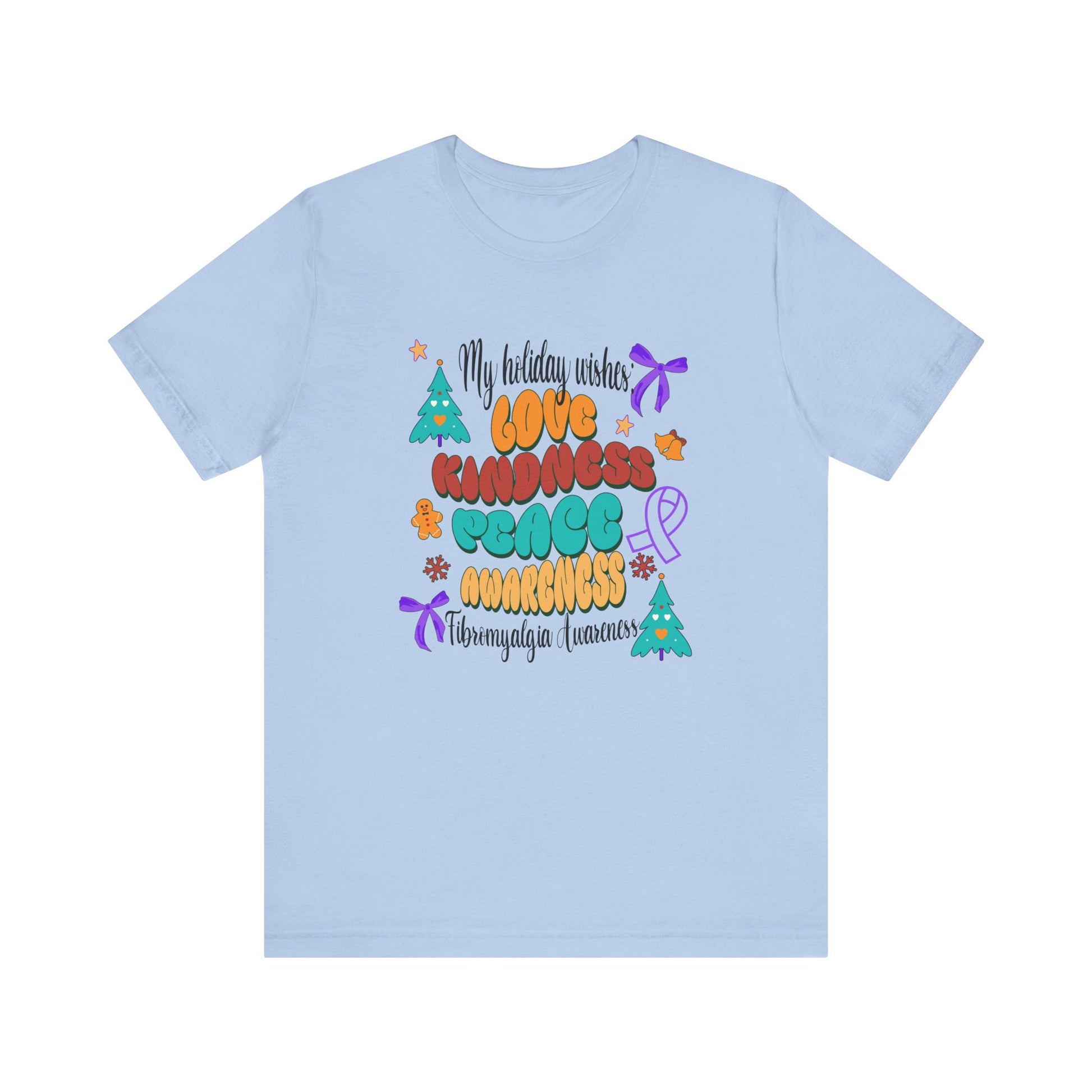 Fibromyalgia Awareness Holiday Wishes tee made with 100% Airlume combed and ring-spun cotton, a lightweight fabric (4.2 oz/yd² (142 g/m²) that is easy to layer, breathable. Perfect for active and leisure wear.