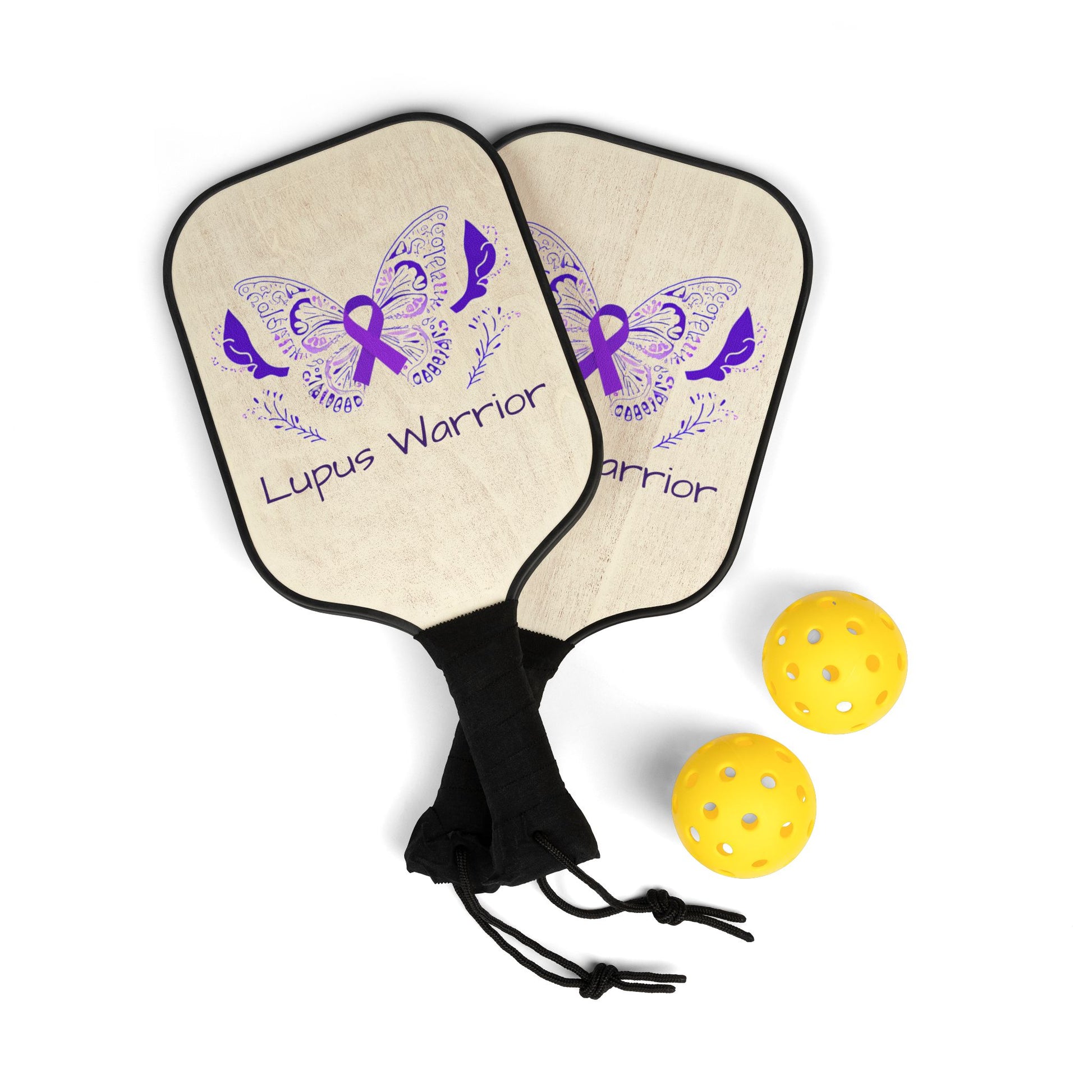 Ready, Set, Play! Our Lupus Warrior pickleball kit includes everything you need for a thrilling match: 2 paddles and 2 balls. Packaged in a convenient transparent bag for easy transport, this kit is perfect for on-the-go fun. Plus, with the print available on both sides, you can showcase your unique style with every swing.