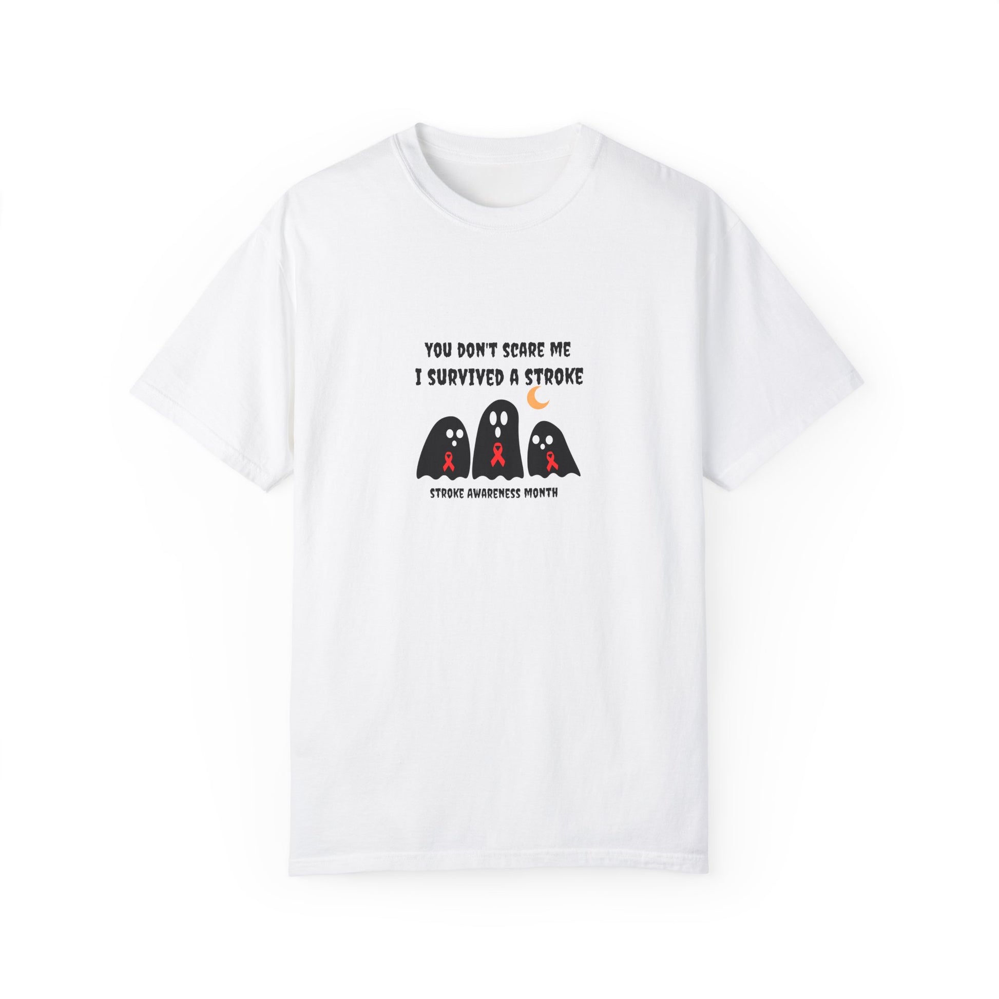 This stroke awareness T-shirt features a playful 'you don't scare me' Halloween ghosts design, perfect for those who want to show their support for stroke awareness in a fun way. It offers a relaxed fit and comfortable medium fabric, making it suitable for both casual wear and semi-formal settings. This tee is relevant for Halloween celebrations and those passionate about spreading stroke awareness. Product features - Available in sizes S to 4XL - Double-needle stitching for durability - Soft color and texture - Made with medium fabric consisting of 100% US ring-spun cotton - Pre-shrunk fabric for consistent fit Care instructions - Machine wash: cold (max 30C or 90F) - Do not bleach - Tumble dry: low heat - Iron, steam or dry: low heat - Do not dryclean