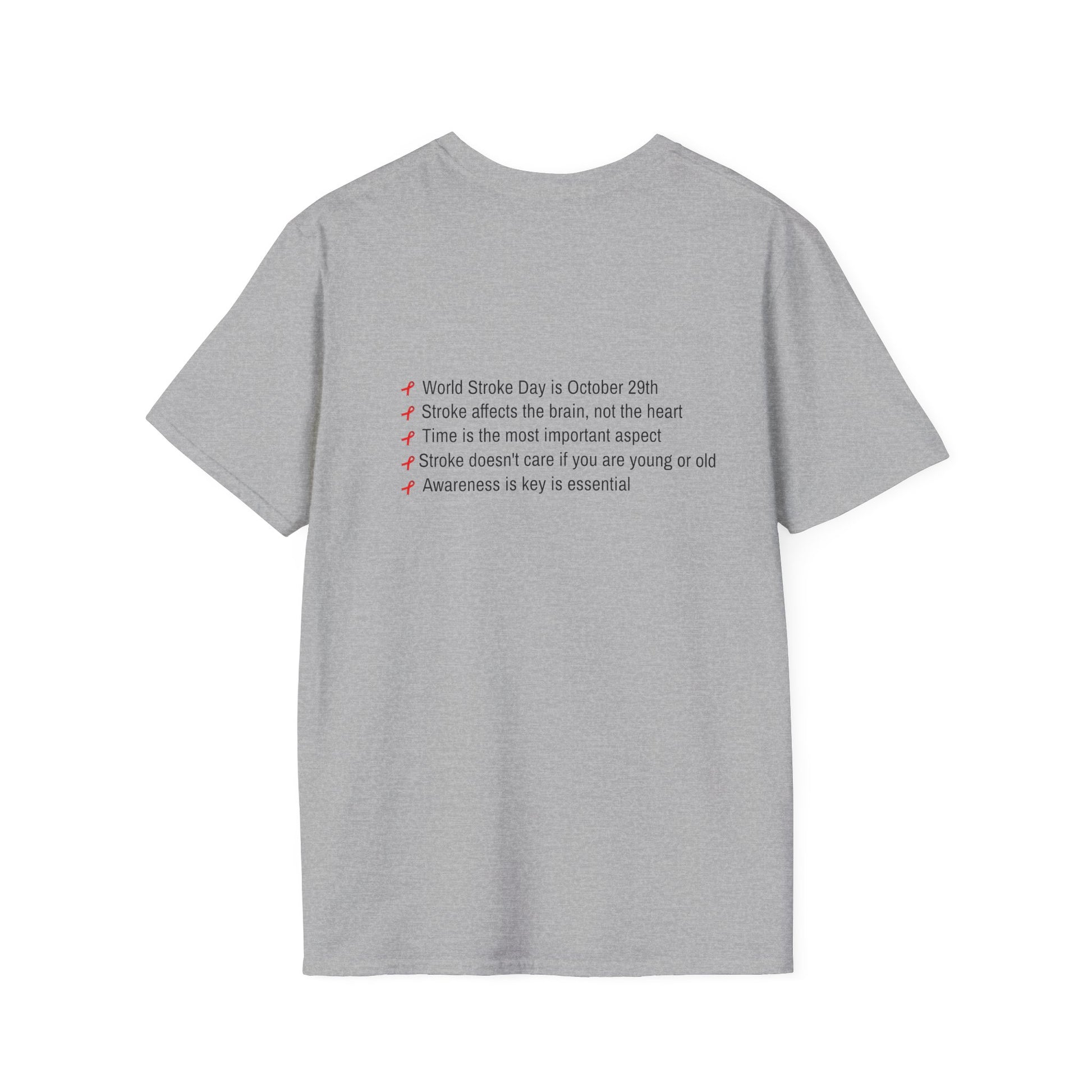 Show your support for stroke awareness with this unisex soft-style t-shirt puts a new spin on casual comfort. Made from very soft materials, this tee is 100% cotton for solid colors. Heather colors and sports grey include polyester. The shoulders have twill tape for improved durability. There are no side seams. The collar is made with ribbed knitting to prevent curling damage.